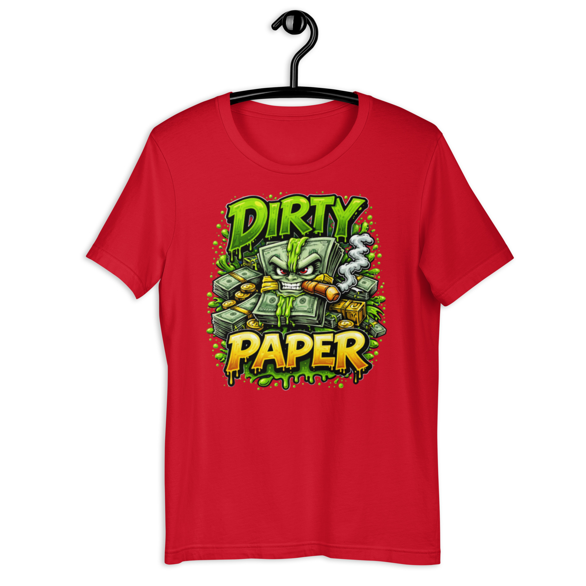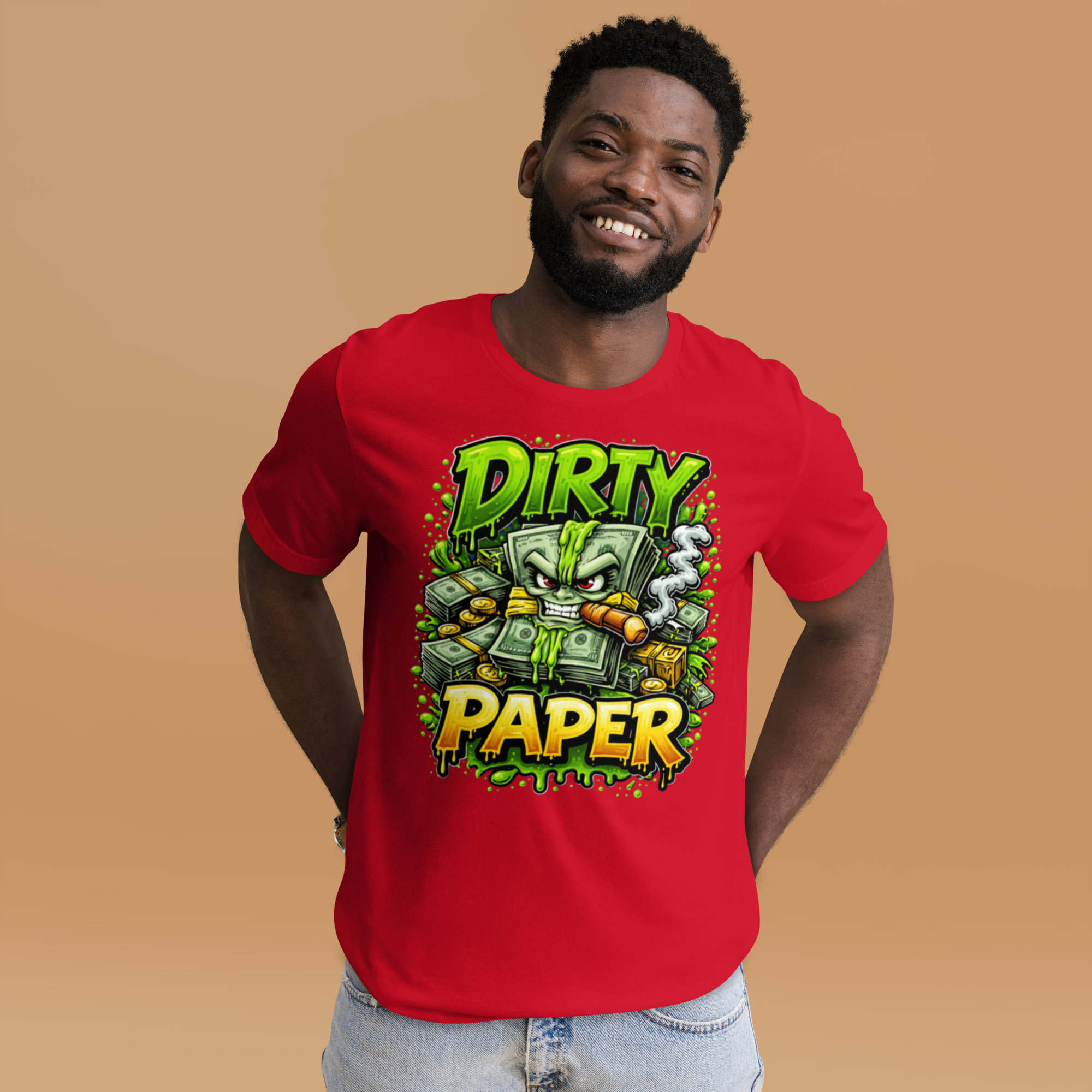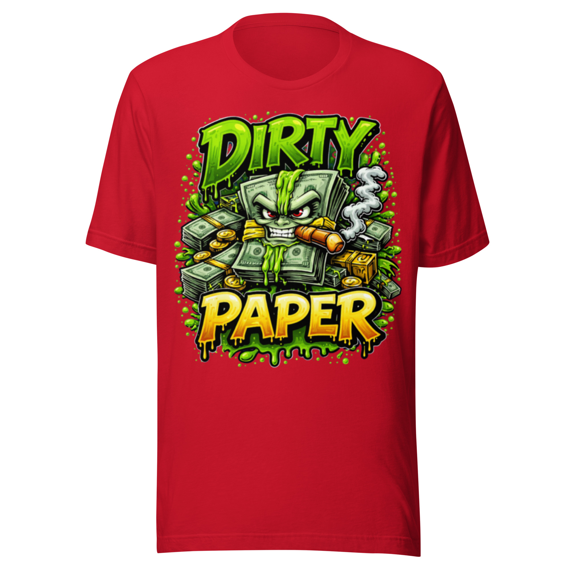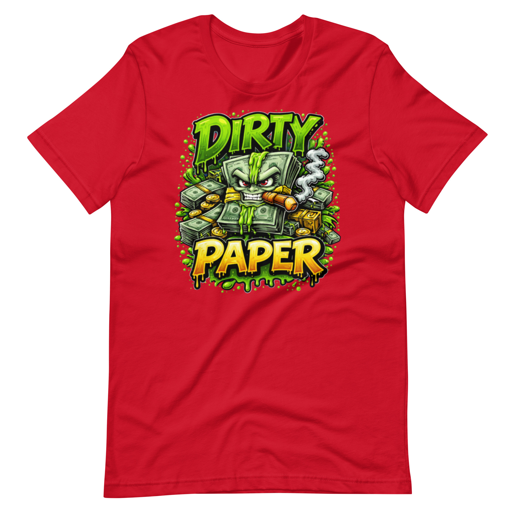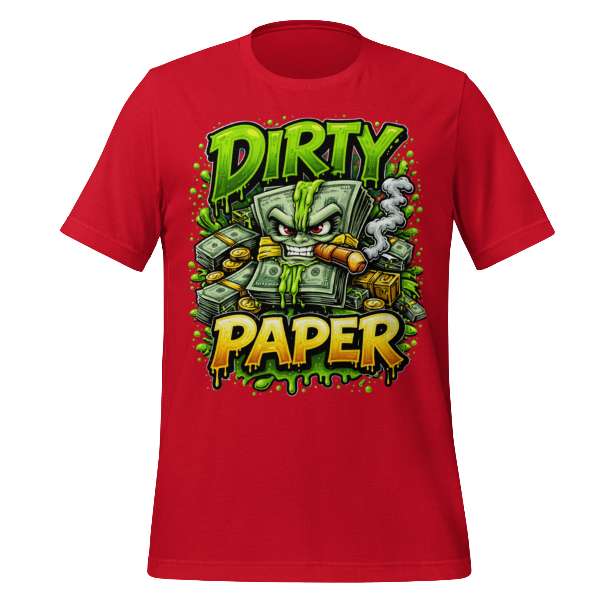 Turn up the heat with this bold “Dirty Paper” graphic tee, now on a striking red base that demands attention. This design features a hard-edged stack-of-cash character brought to life with gritty street art styling—complete with glowing green drips, scattered coins, and a raw, money-driven attitude.