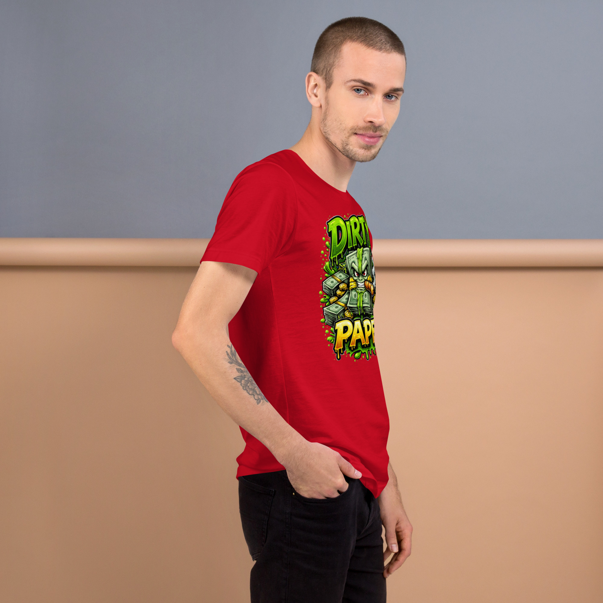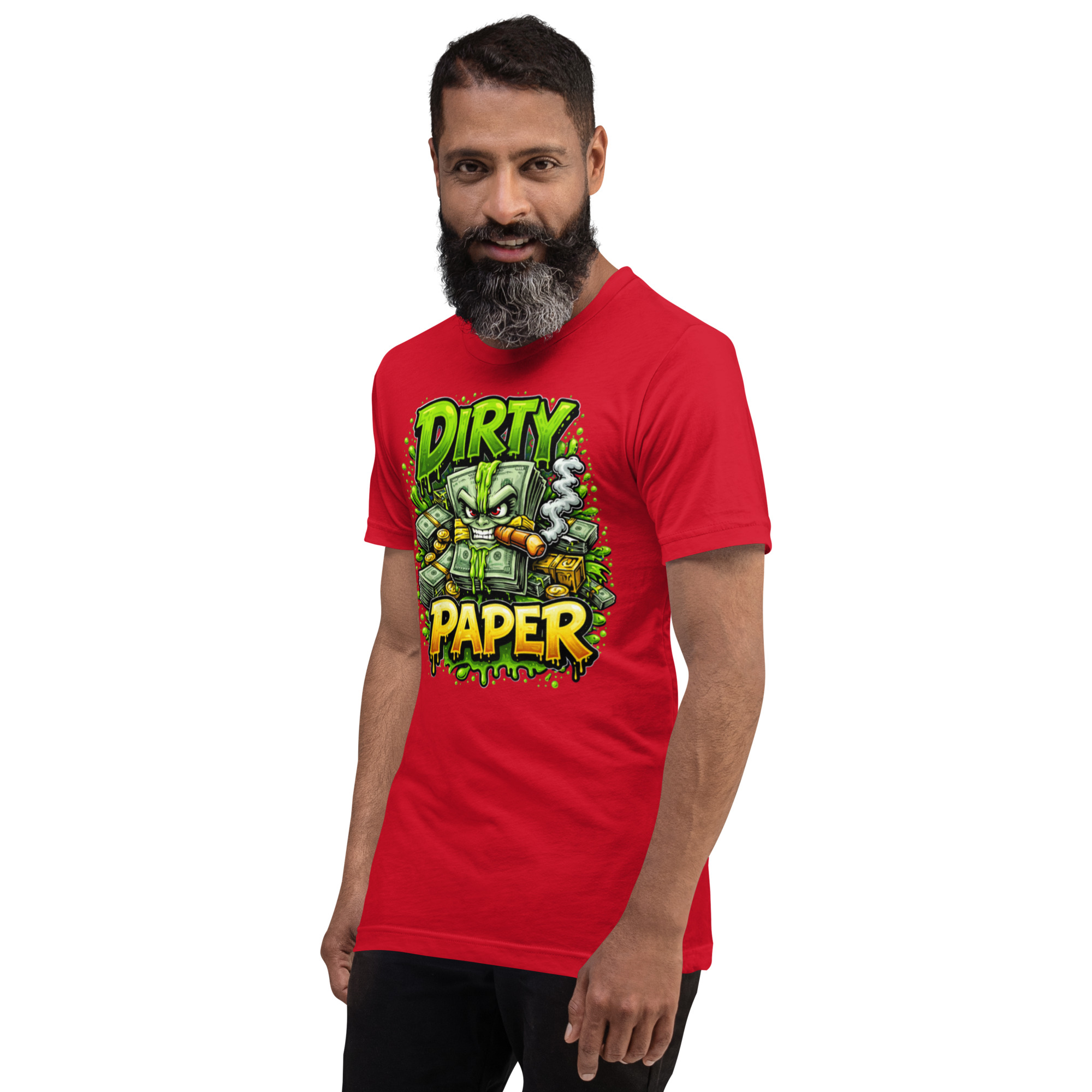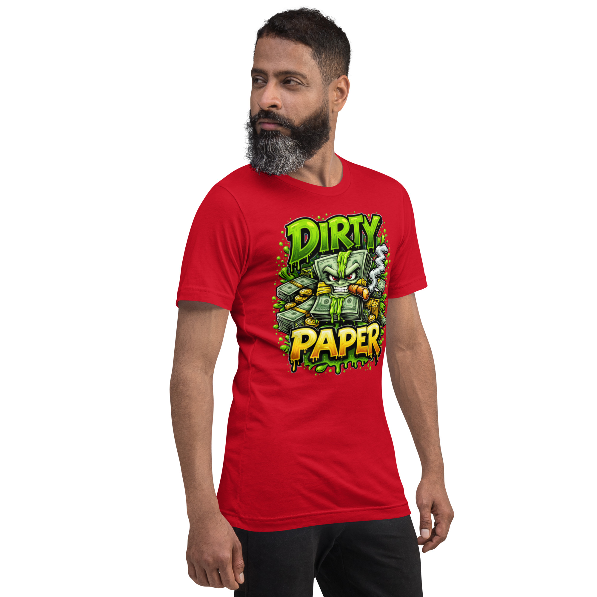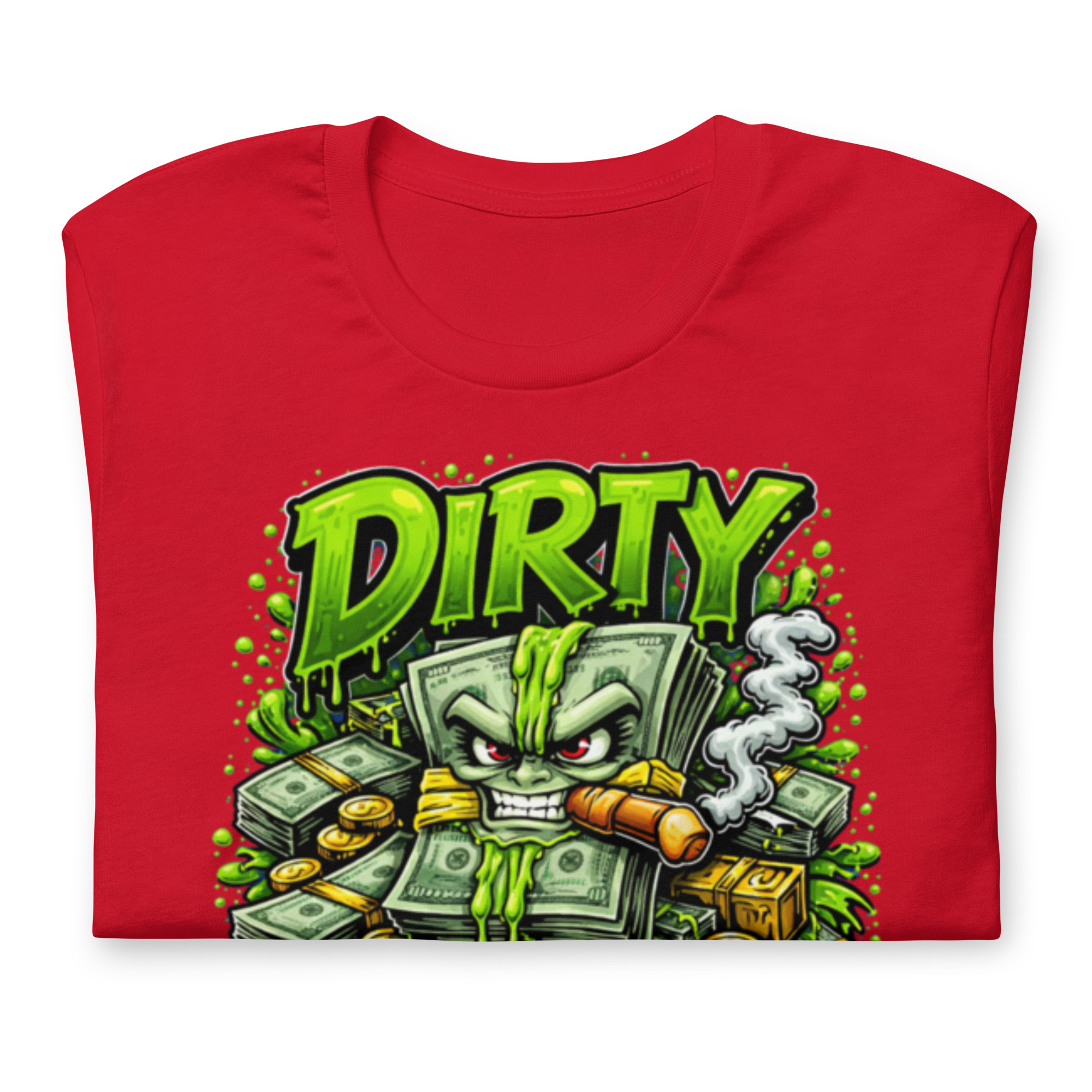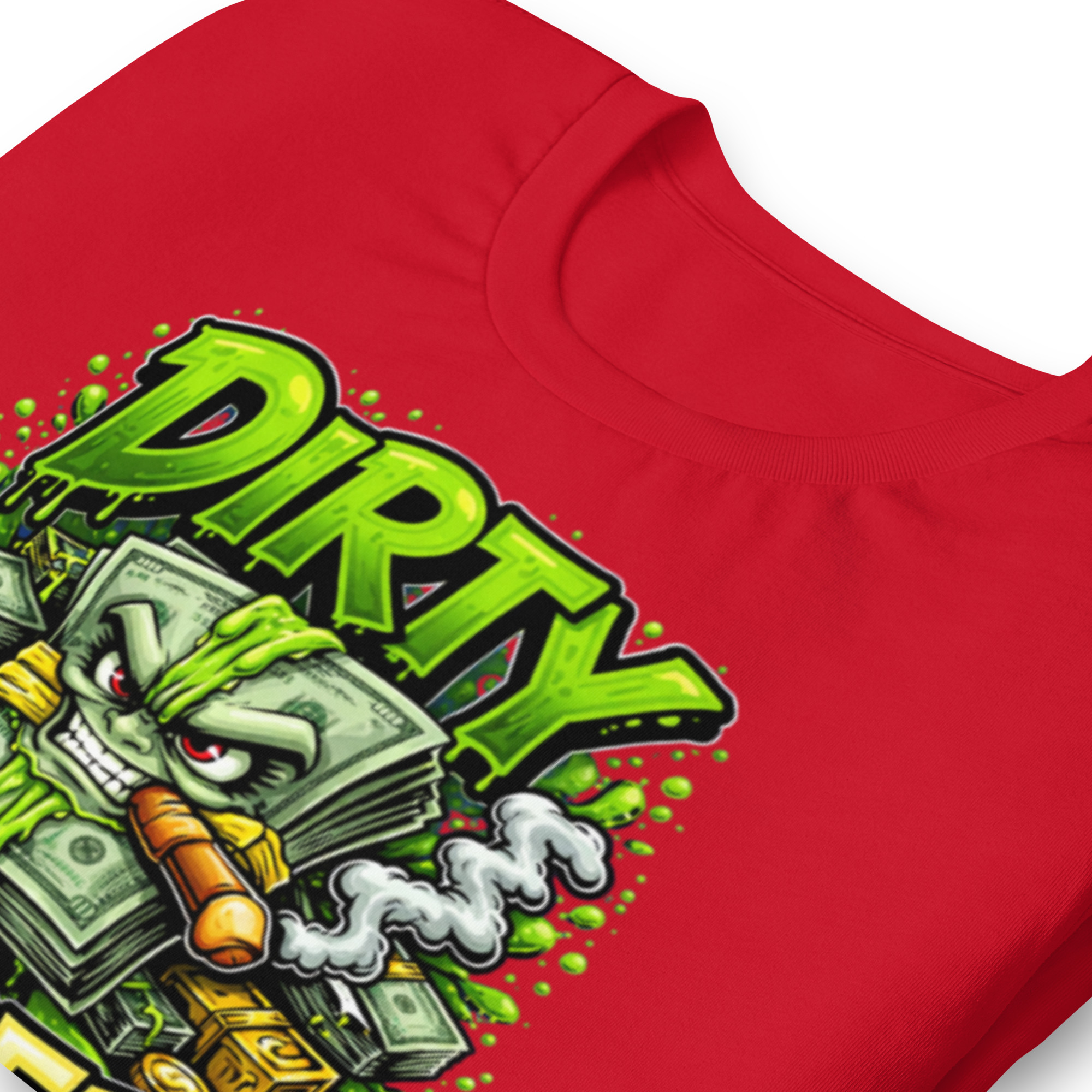 Turn up the heat with this bold “Dirty Paper” graphic tee, now on a striking red base that demands attention. This design features a hard-edged stack-of-cash character brought to life with gritty street art styling—complete with glowing green drips, scattered coins, and a raw, money-driven attitude.