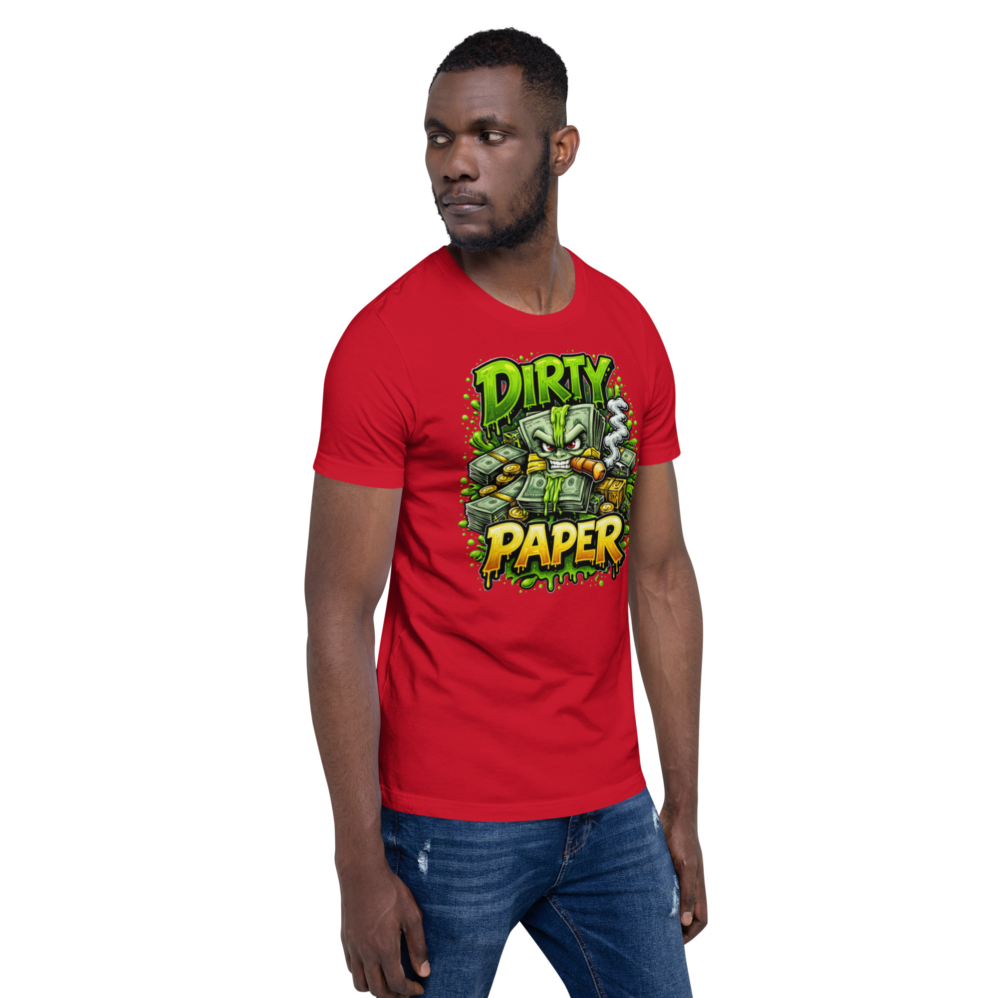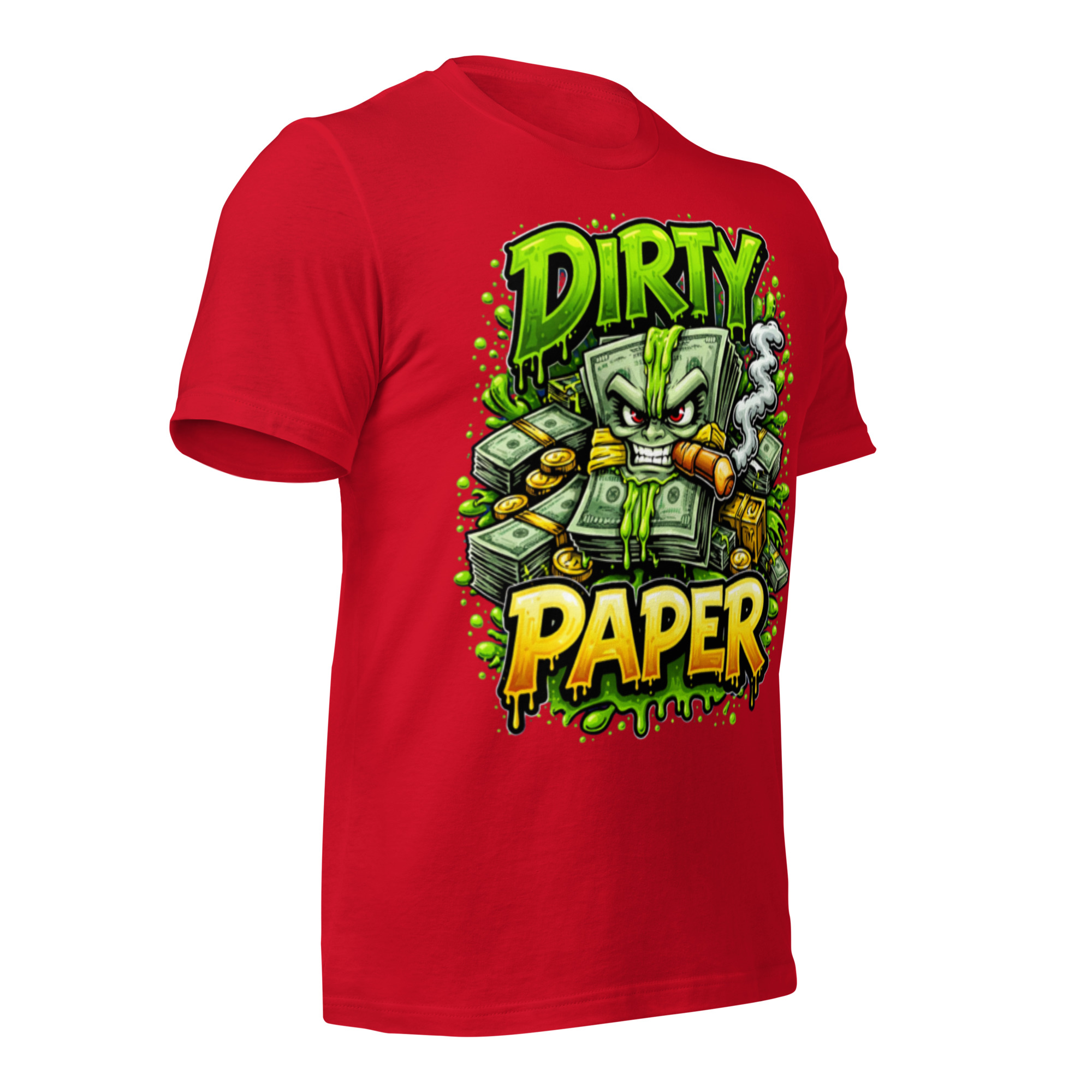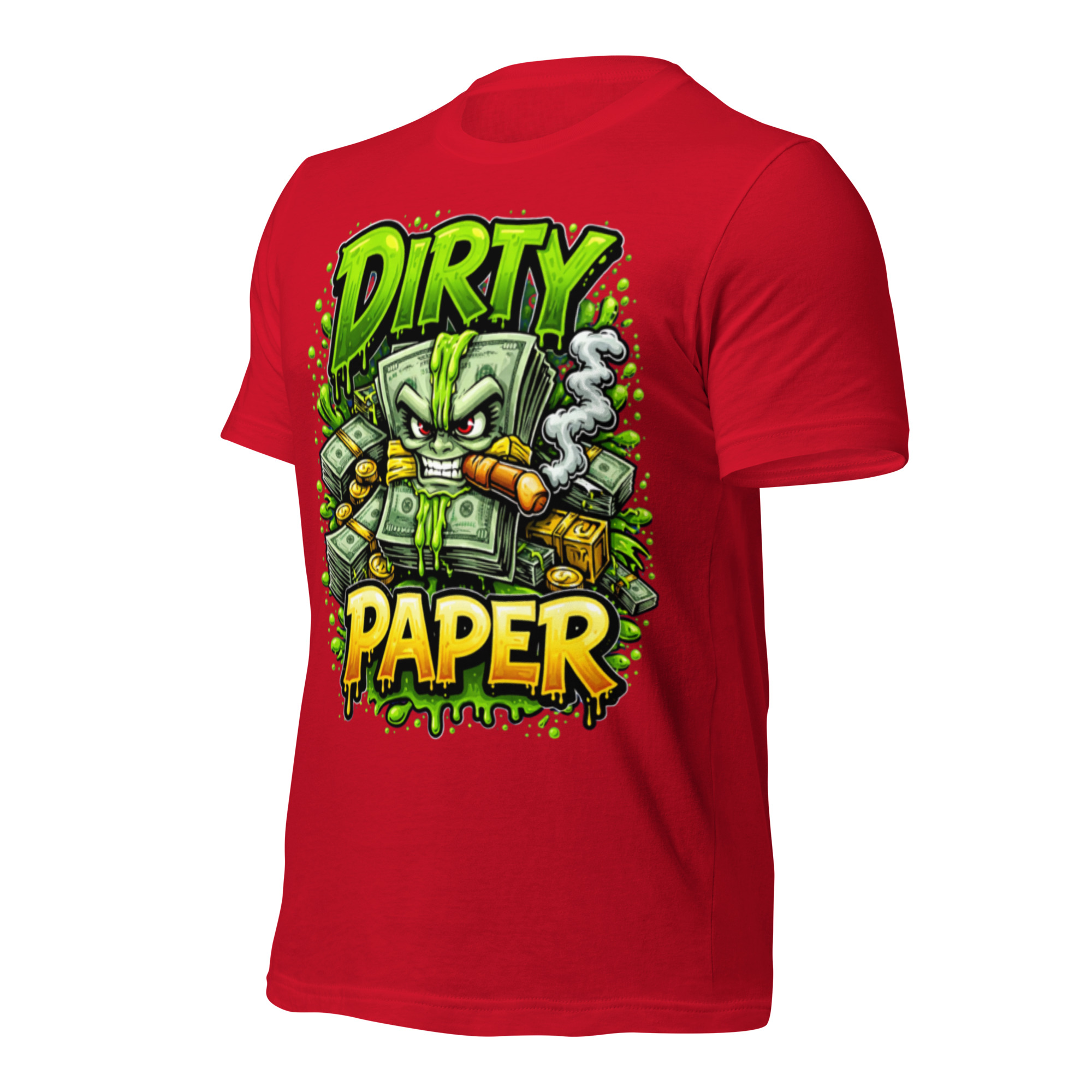 The vivid contrast between the neon green artwork and the red shirt creates an intense, high-impact look that stands out anywhere—whether you’re out on the street, at an event, or building your brand presence. The graffiti-inspired “Dirty Paper” lettering adds that authentic urban edge, making this piece perfect for anyone who lives the hustle mindset.