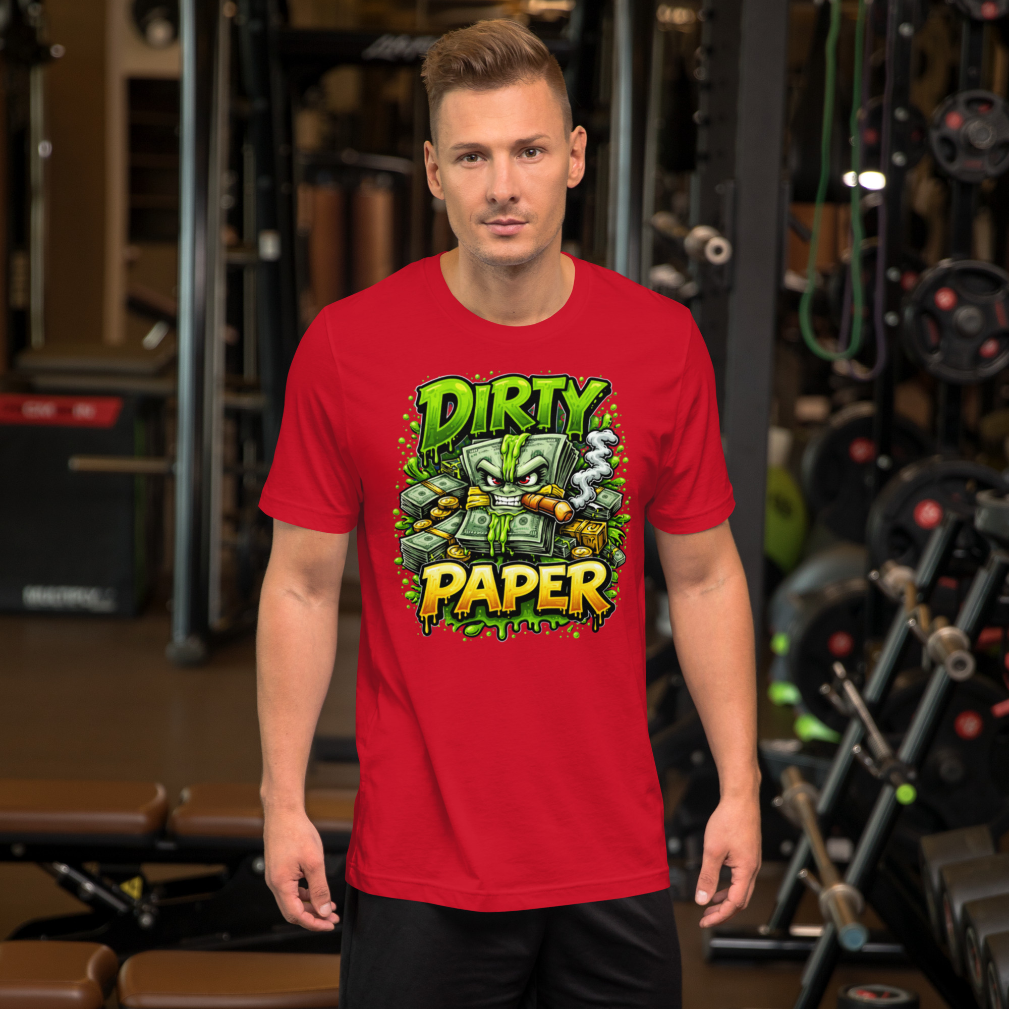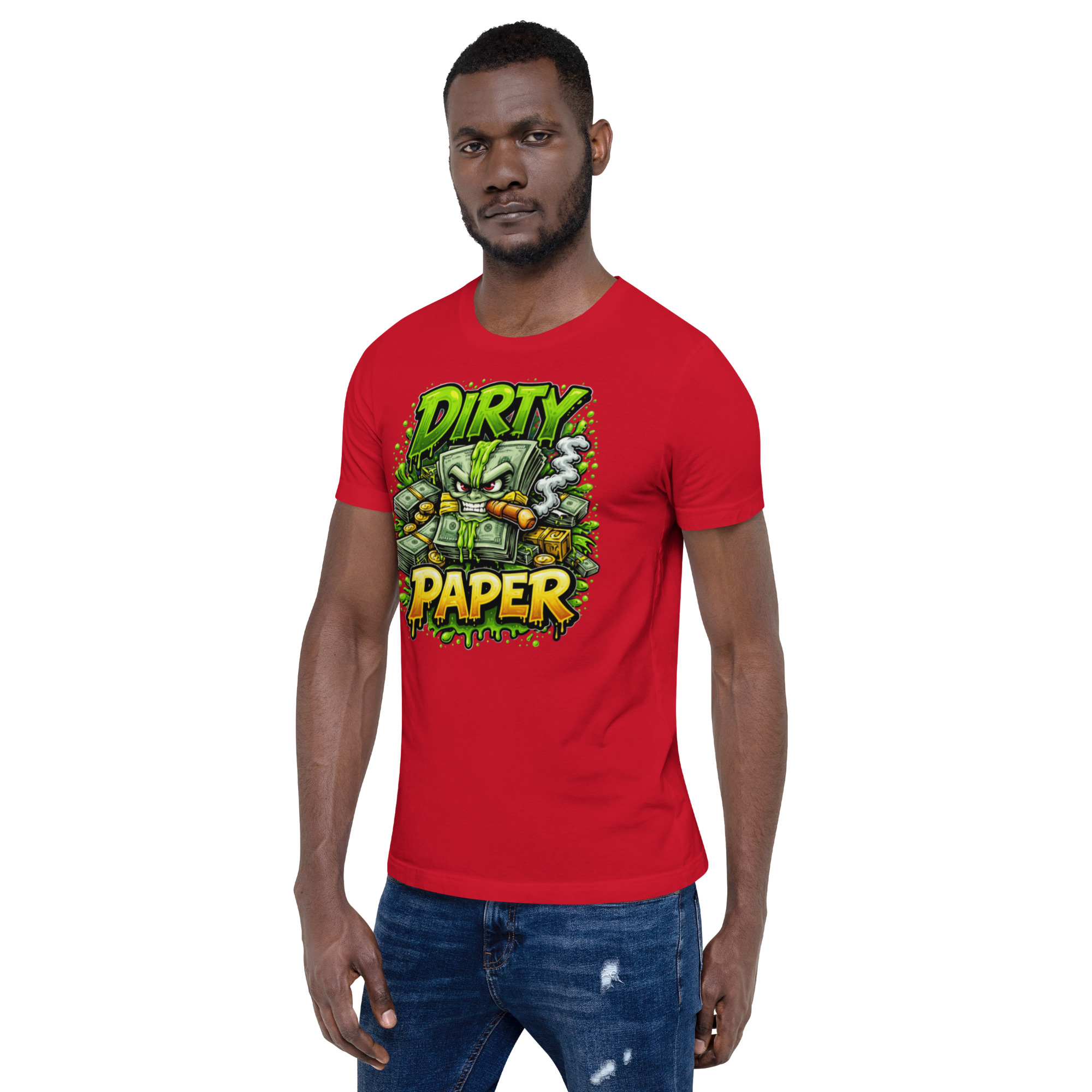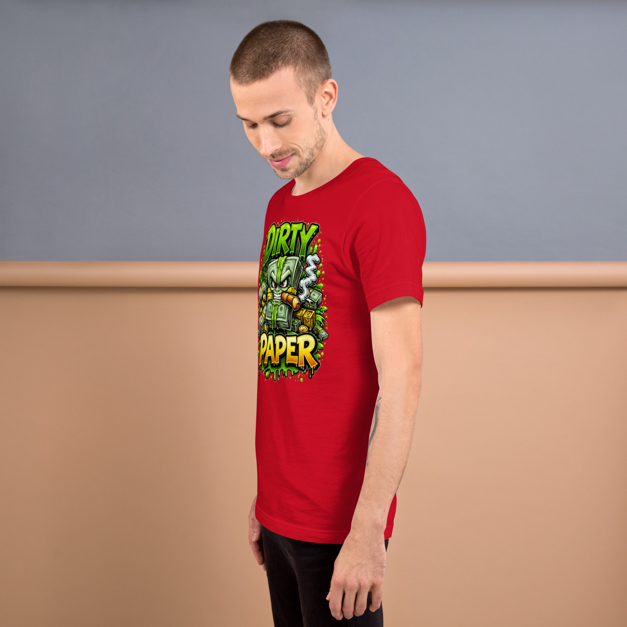 The vivid contrast between the neon green artwork and the red shirt creates an intense, high-impact look that stands out anywhere—whether you’re out on the street, at an event, or building your brand presence. The graffiti-inspired “Dirty Paper” lettering adds that authentic urban edge, making this piece perfect for anyone who lives the hustle mindset.