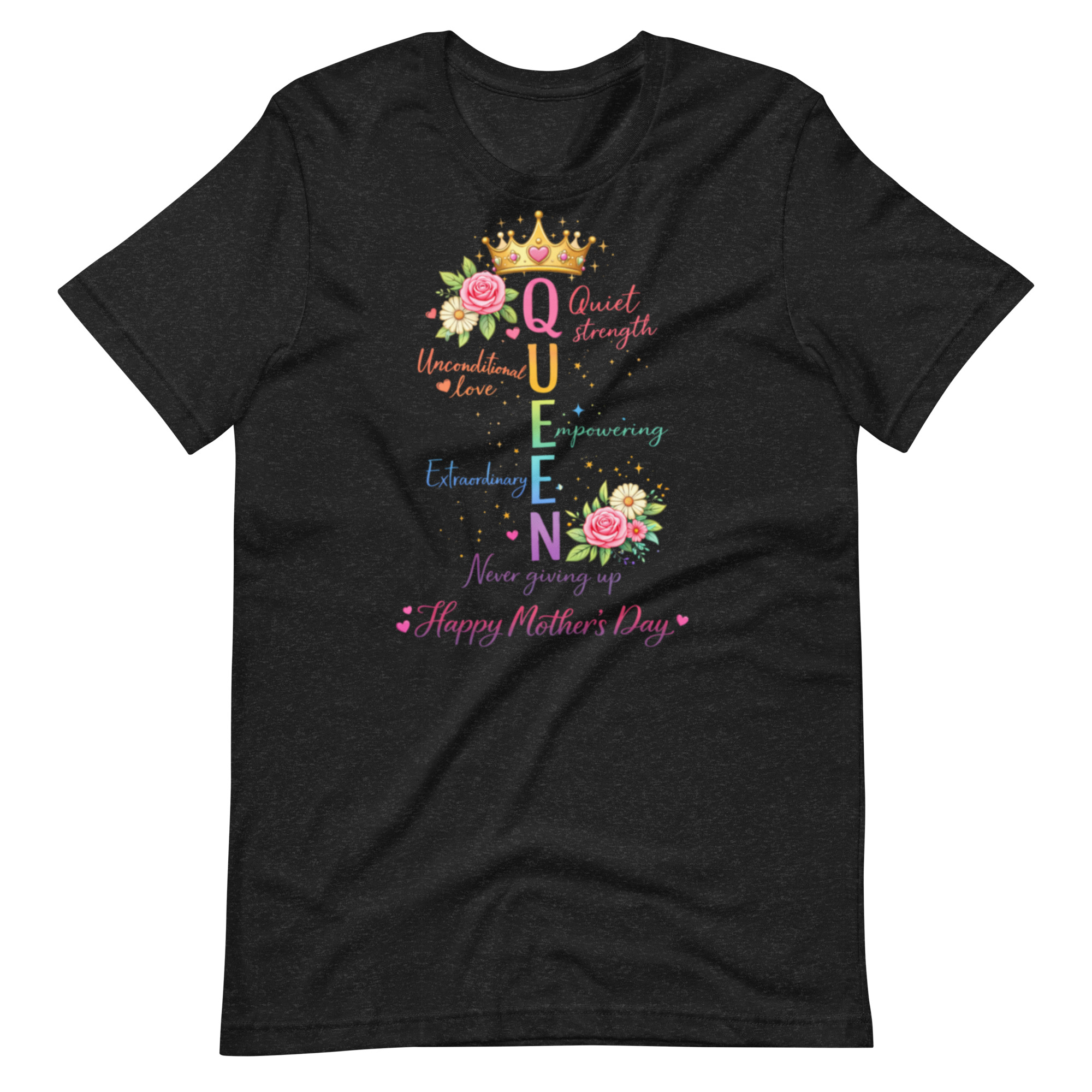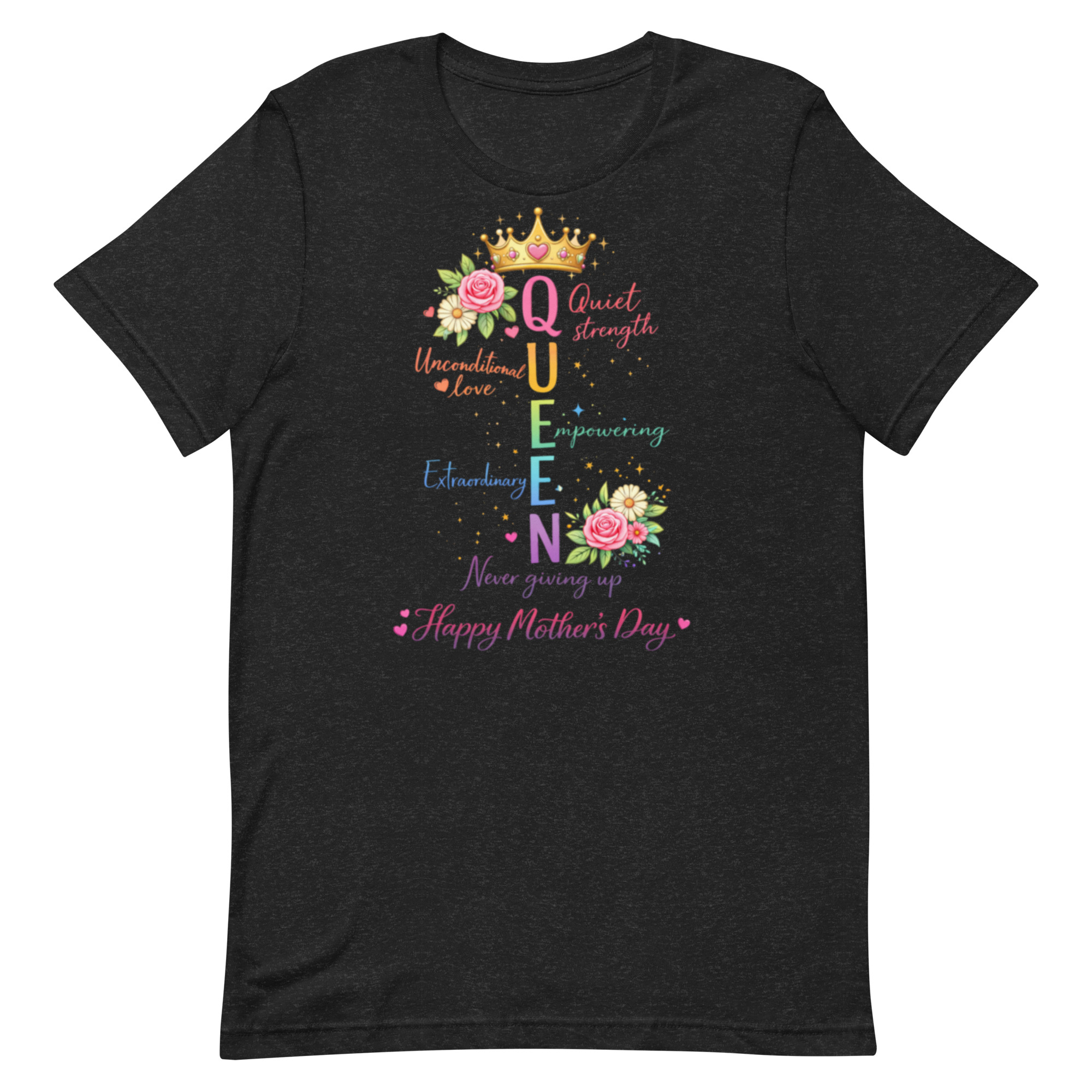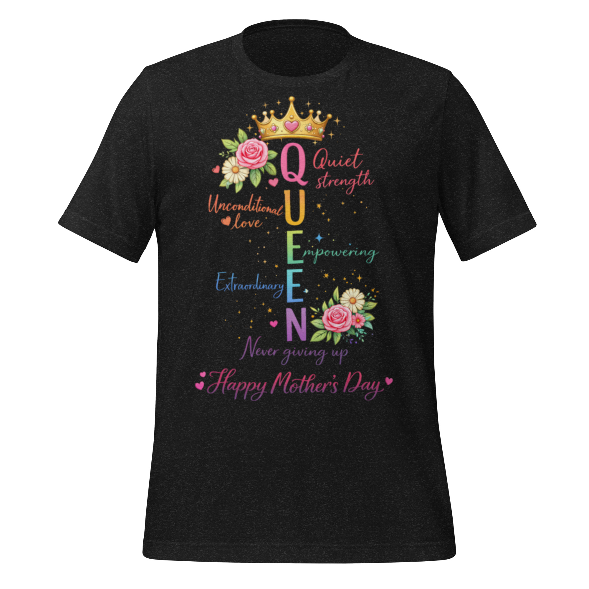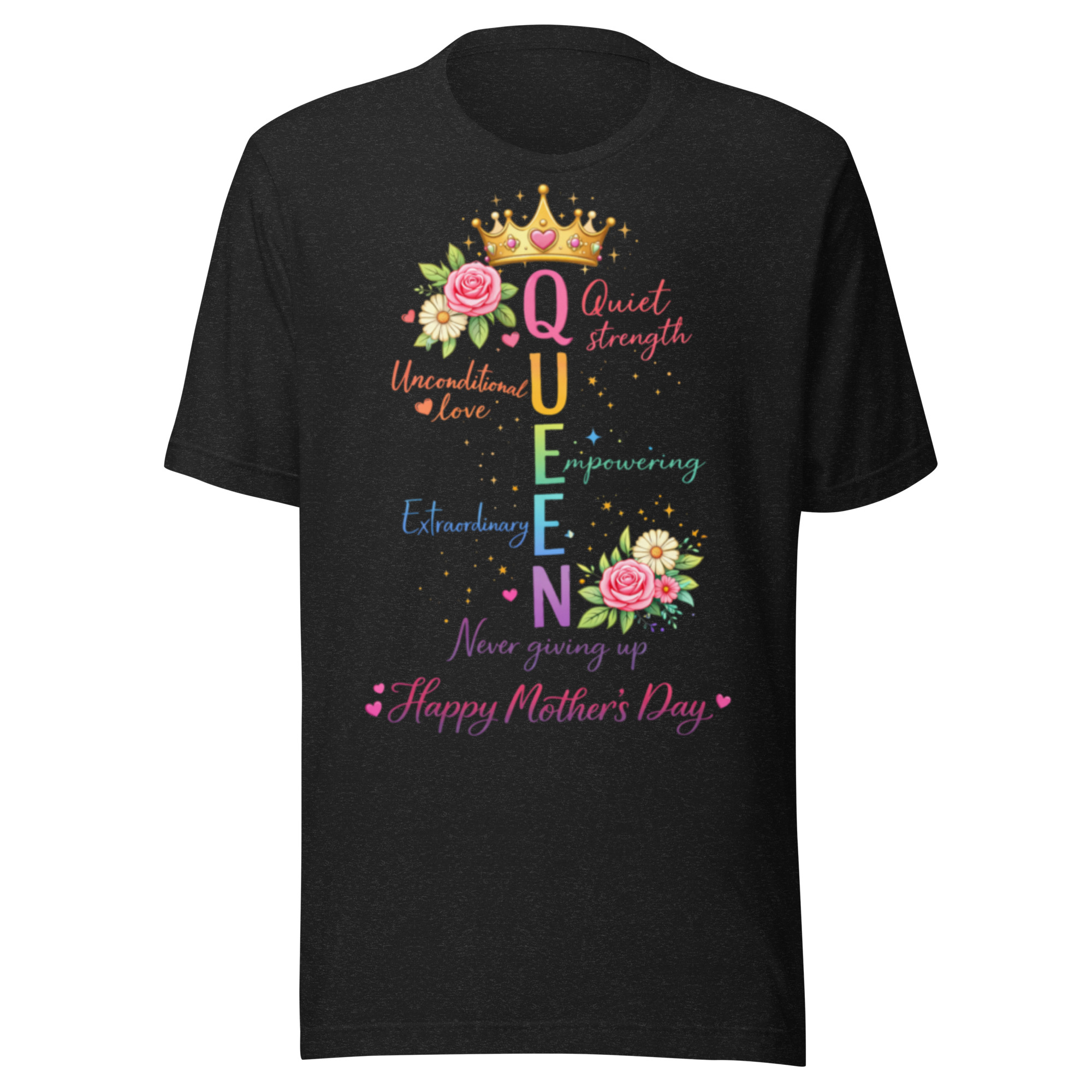 Celebrate the strength, love, and beauty of moms everywhere with this elegant “Queen” Mother’s Day graphic tee. Featuring a colorful acrostic design, each letter in QUEEN represents the powerful qualities that define motherhood—Quiet strength, Unconditional love, Empowering, Extraordinary, and Never giving up.