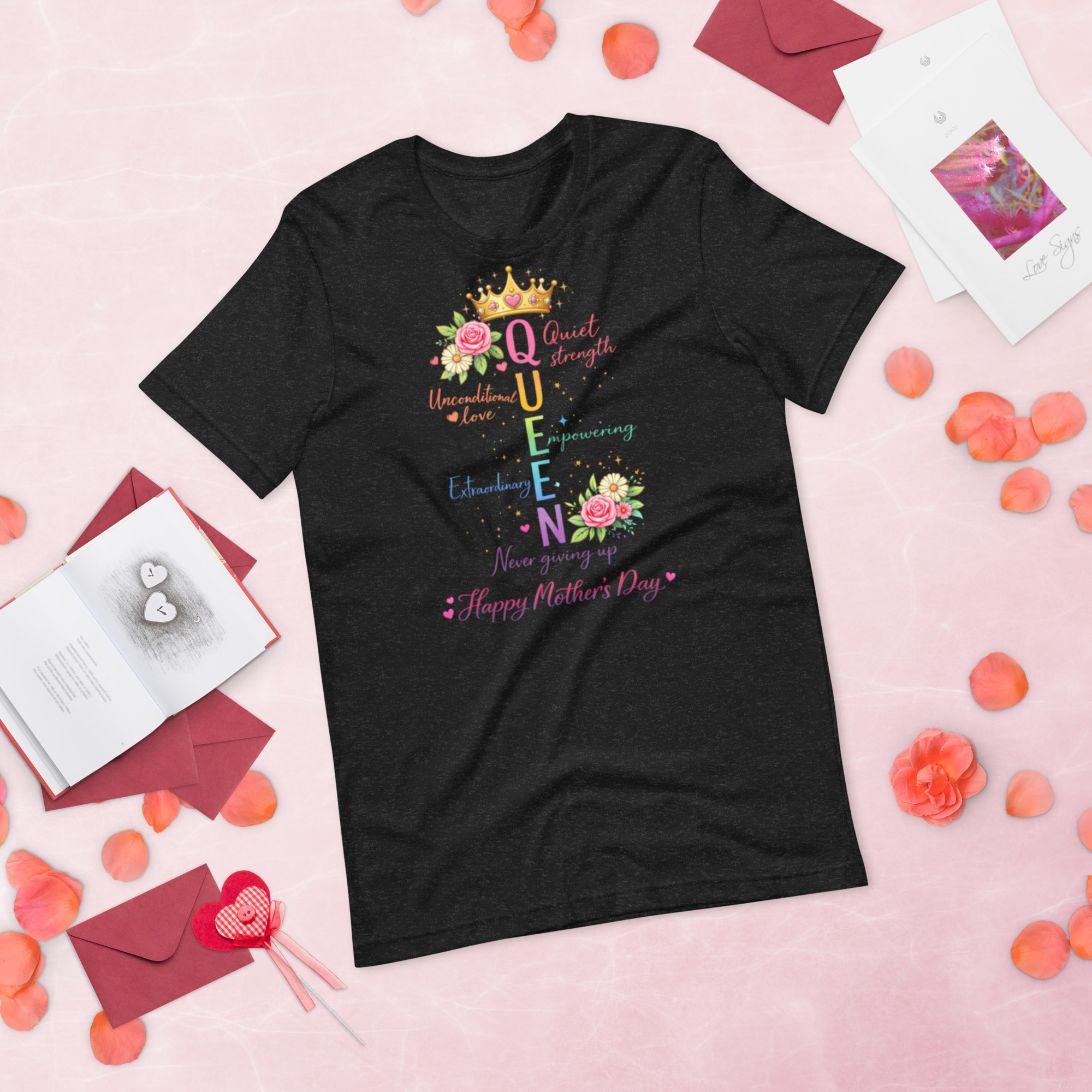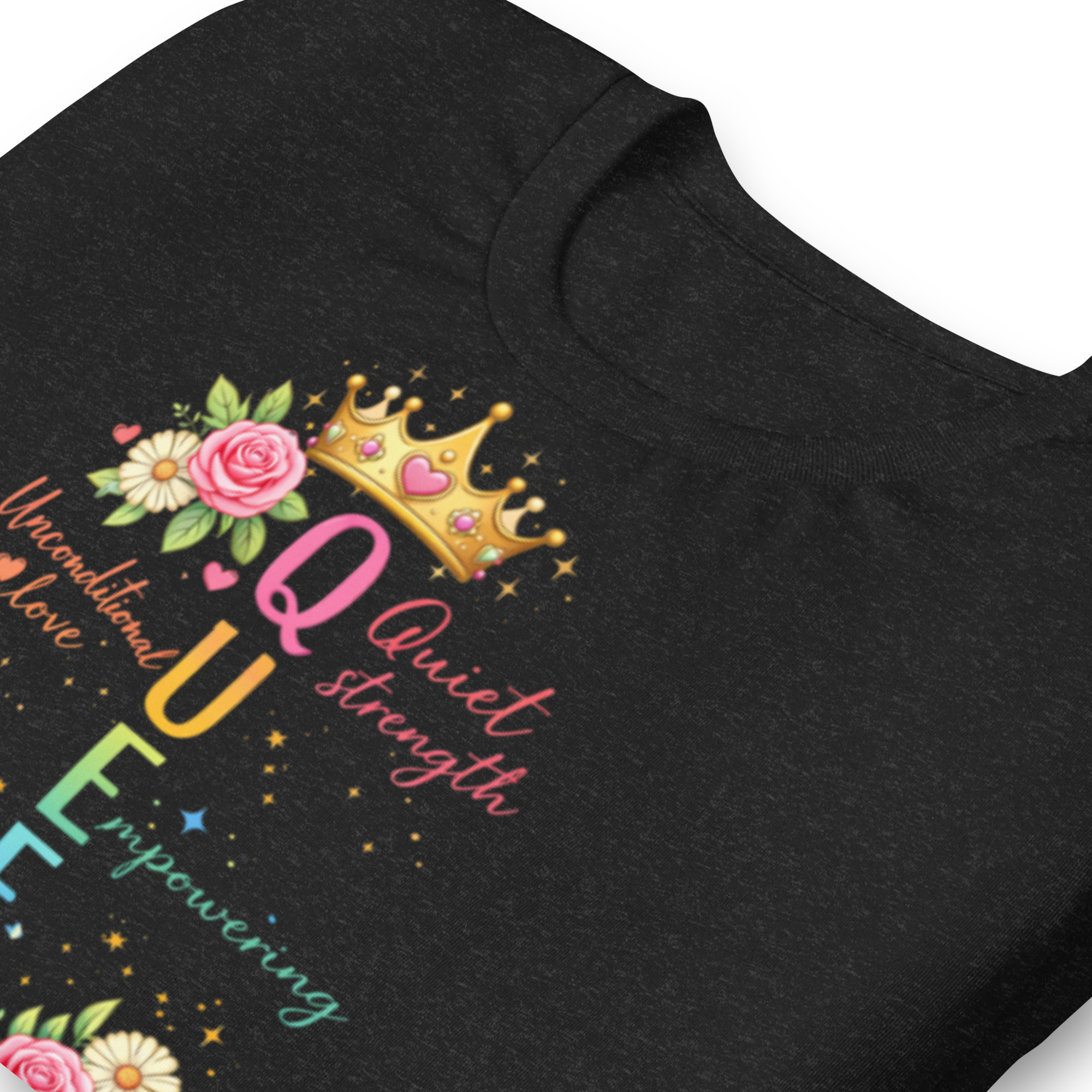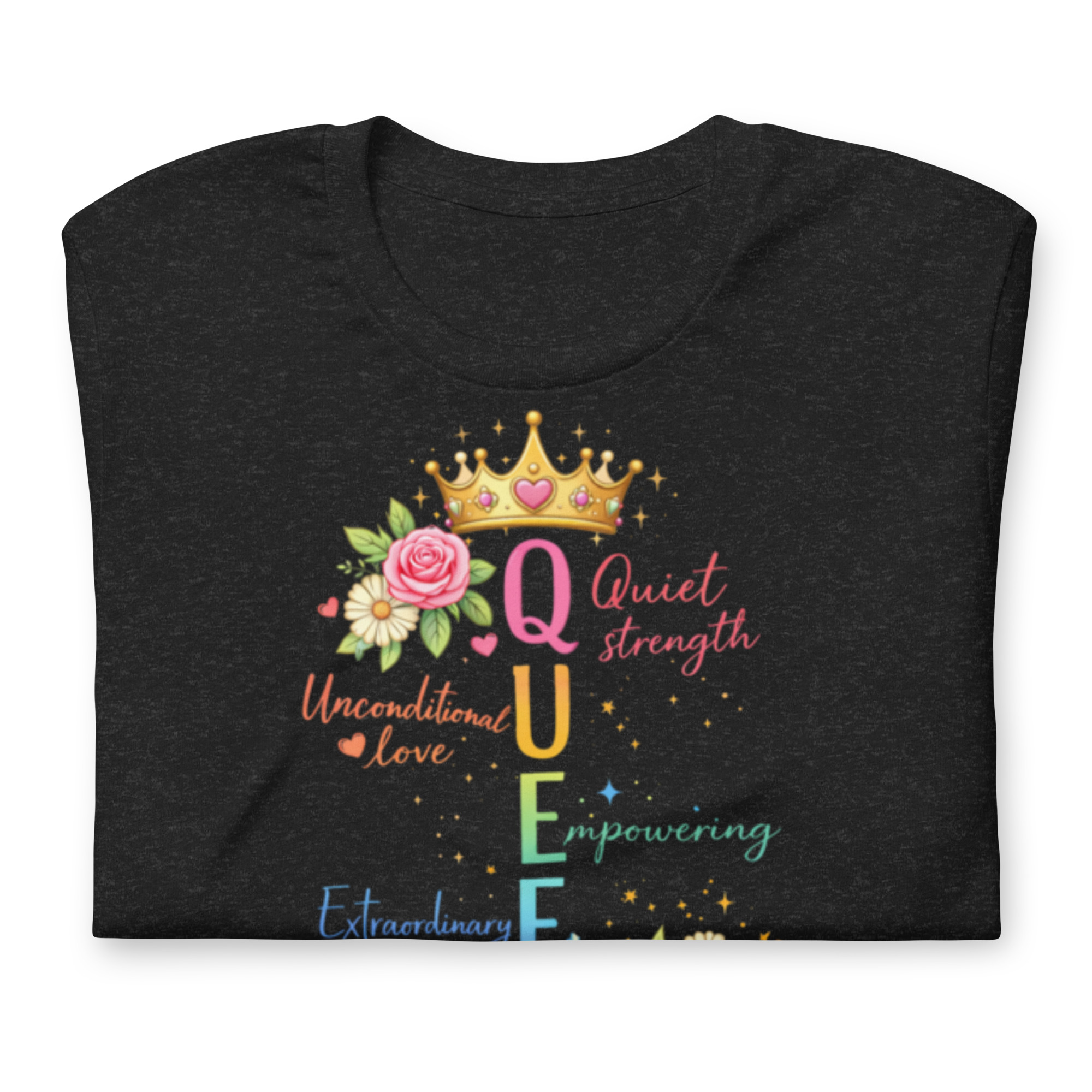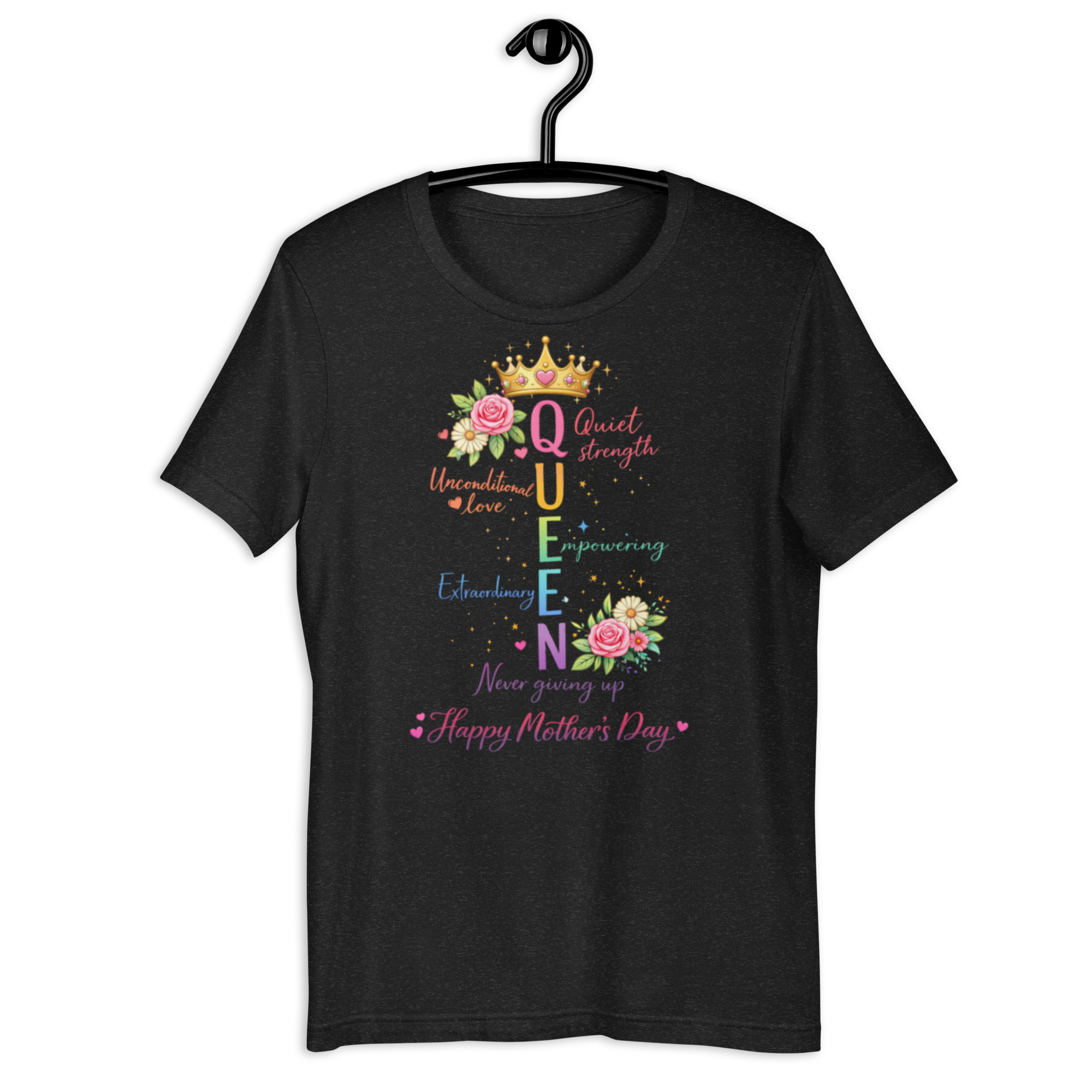 Celebrate the strength, love, and beauty of moms everywhere with this elegant “Queen” Mother’s Day graphic tee. Featuring a colorful acrostic design, each letter in QUEEN represents the powerful qualities that define motherhood—Quiet strength, Unconditional love, Empowering, Extraordinary, and Never giving up.